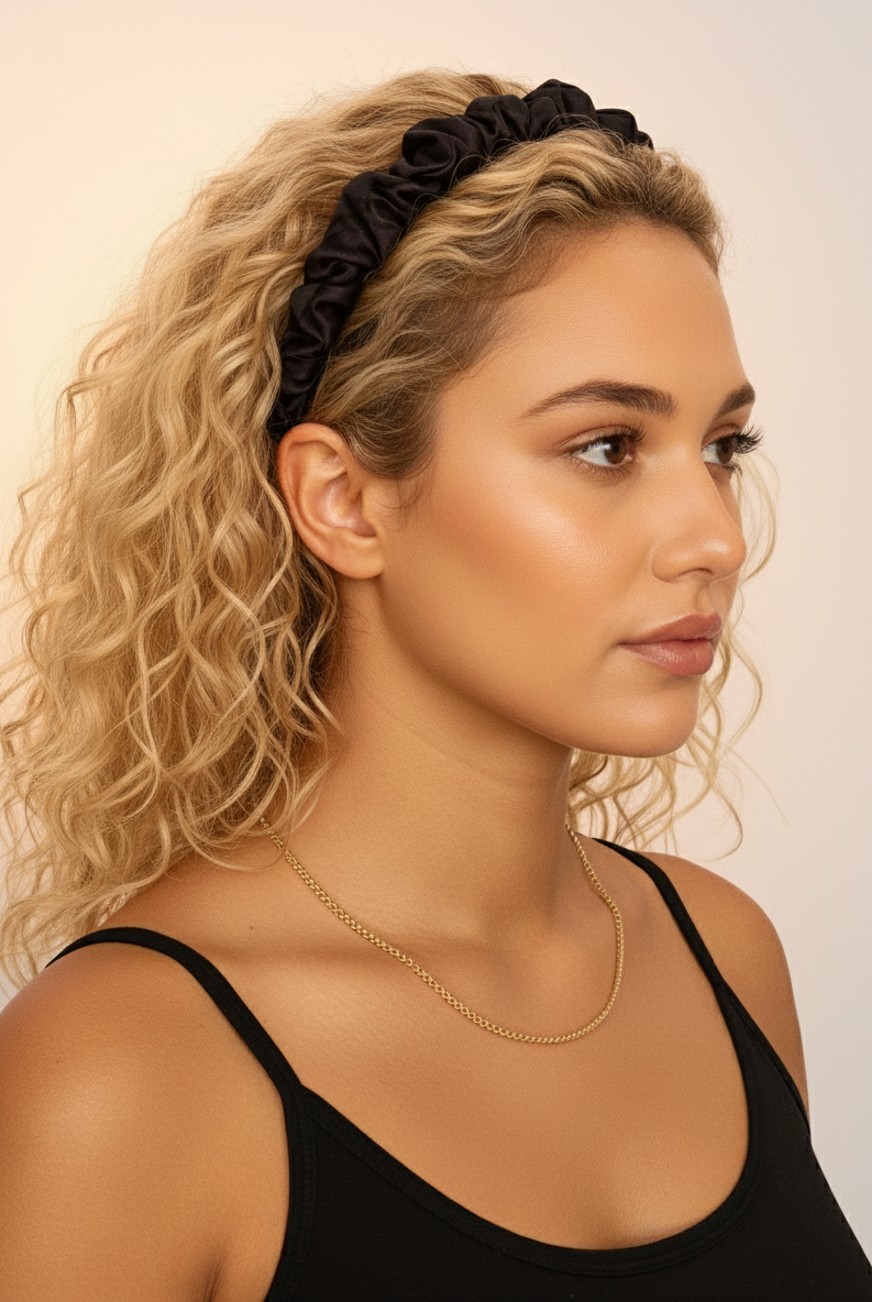 Fit Notes: The one size fits most hair turban and eye mask fits a range of short to long hair lengths and head sizes from 20" - 24" in circumference, measured where the elastic band sits.
