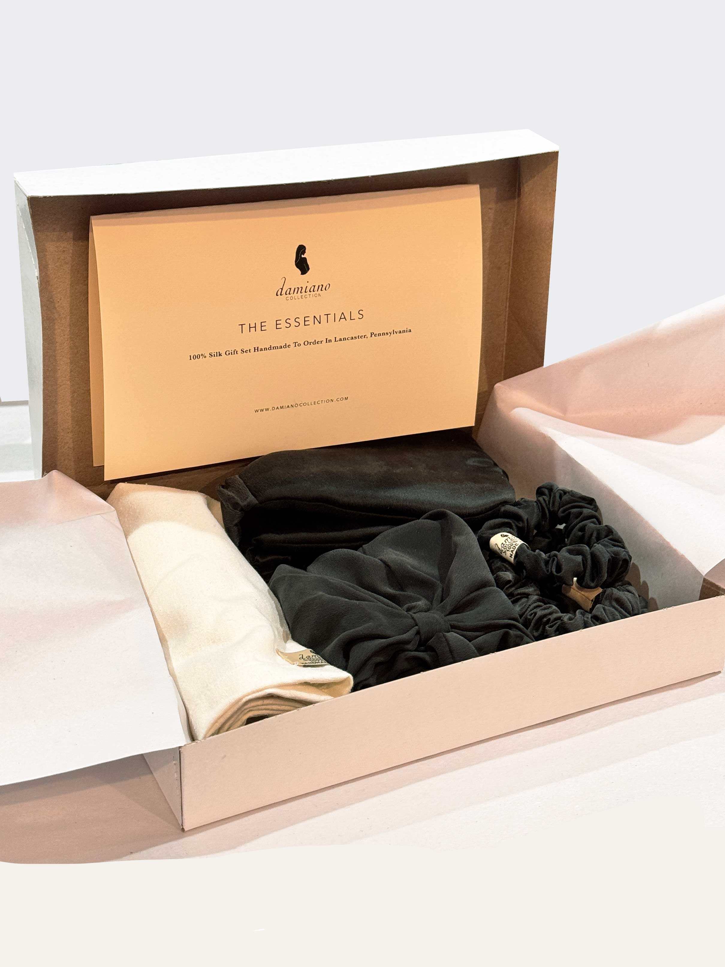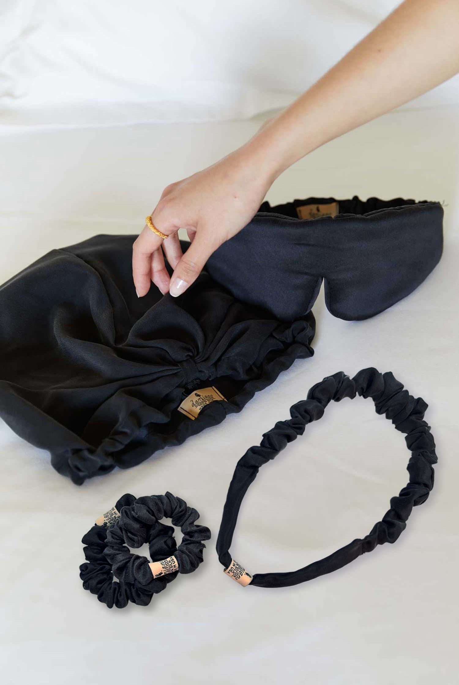 This 100% silk gift set combines our best selling accessories in a modern essential pack for gentle anti-frizz hair care, styling and relaxation.