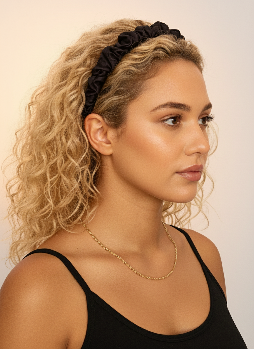Sand washed silk has a soft suede-like texture and slightly less shine. This specialty silk is ideal for increasing durability and longevity of the fabric, making the hairbands suitable for use on wet or dry hair. It also gives a micro-texture to the silk that helps it gently grip the hair.