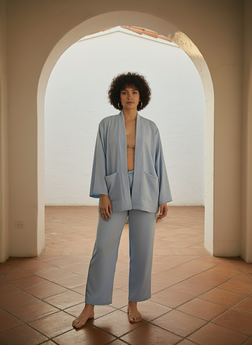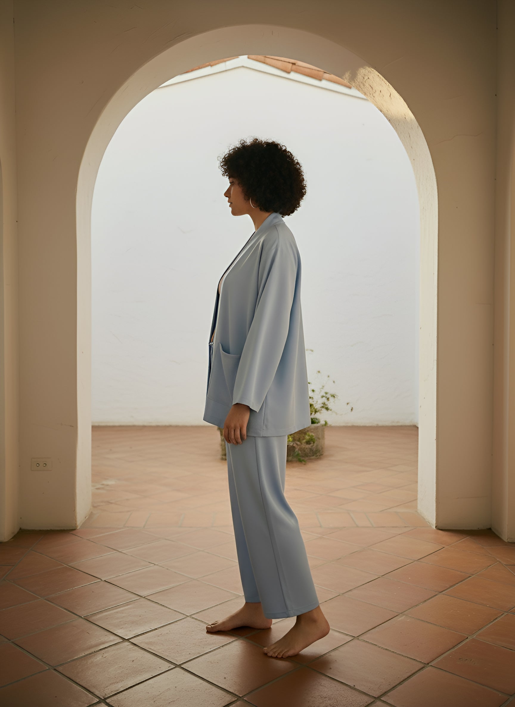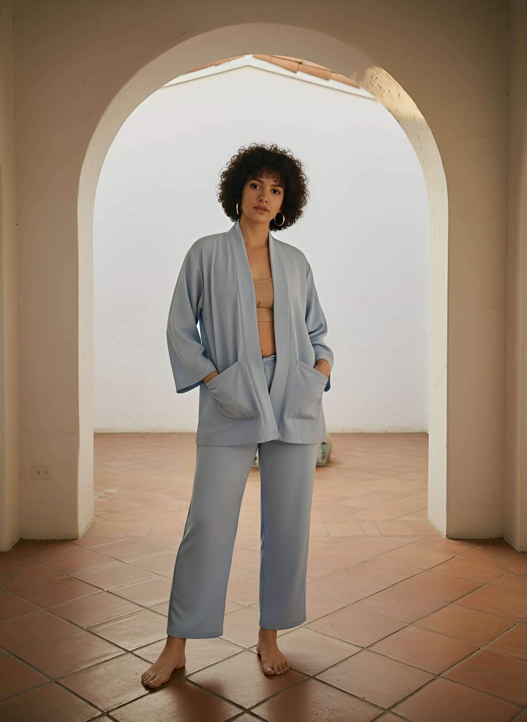 Crafted from premium raw silk noil, this set pairs the Raw Silk Pocket Trouser with the Raw Silk House Jacket for a breathable, lightweight all-day lounge outfit.