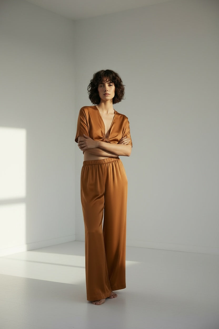 The washed silk blouse and pant set features our wide leg easy pant and wrap blouse. Crafted from machine washable 100% sandwashed silk, this set is luxuriously soft with a beautiful drape. Dress it up or wear for lounge. They will easily mix and match within your existing wardrobe.