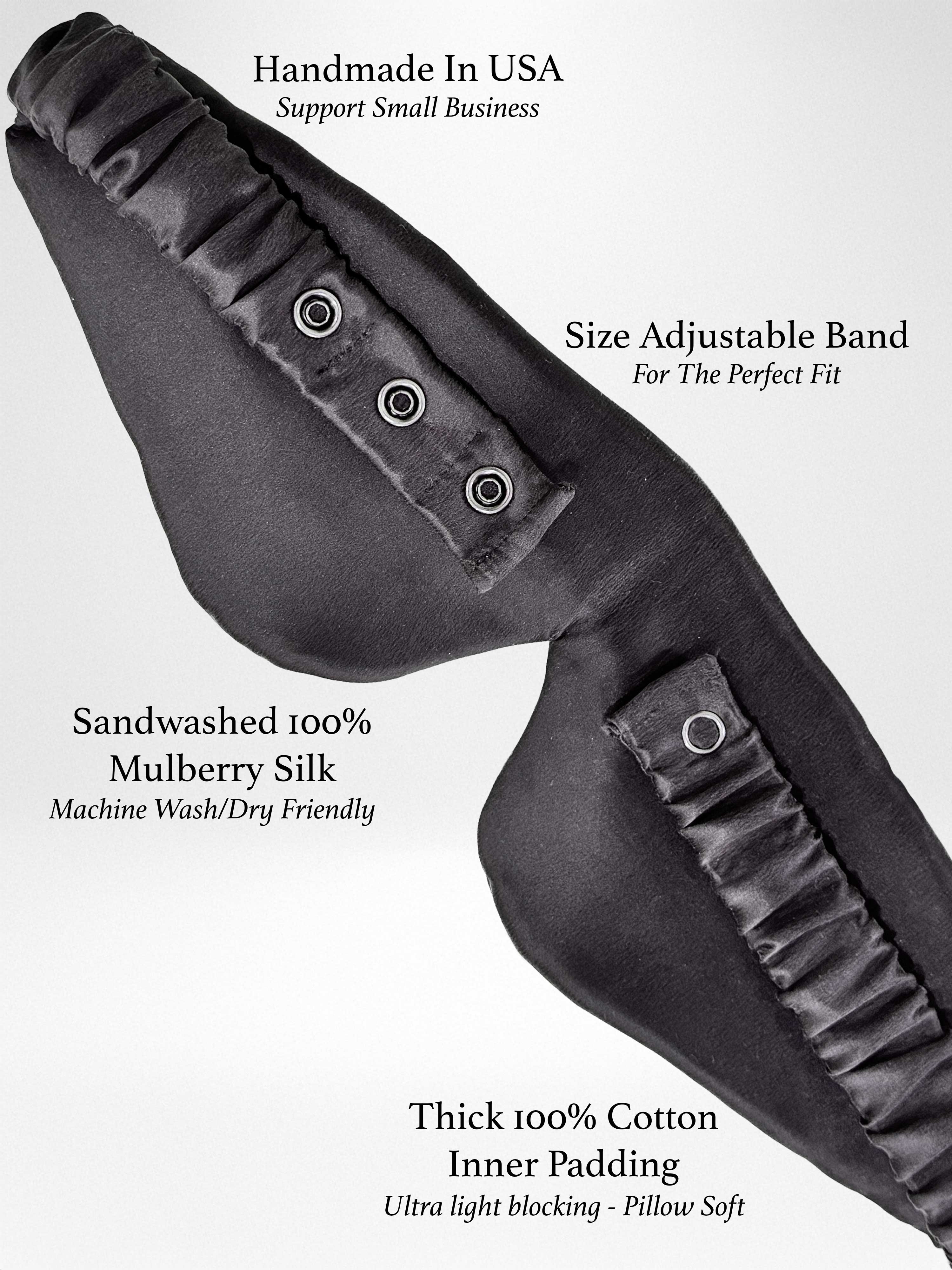Sleep soundly with our light-blocking machine washable padded silk eye mask, handmade from all natural materials. Our 100% silk eye mask feels smooth over the eyes, with extra plush 100% cotton padding on the inside. The back band is fully covered elastic and size adjustable for a comfortable fit.