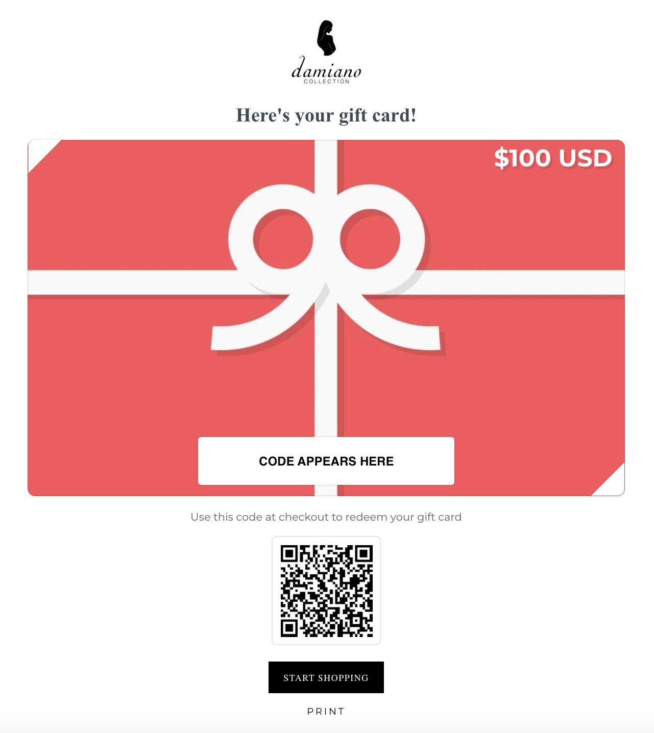 If you would like a specific amount other than the available gift card values, please e-mail us at Shop@damianocollection.com. We would be glad to help!