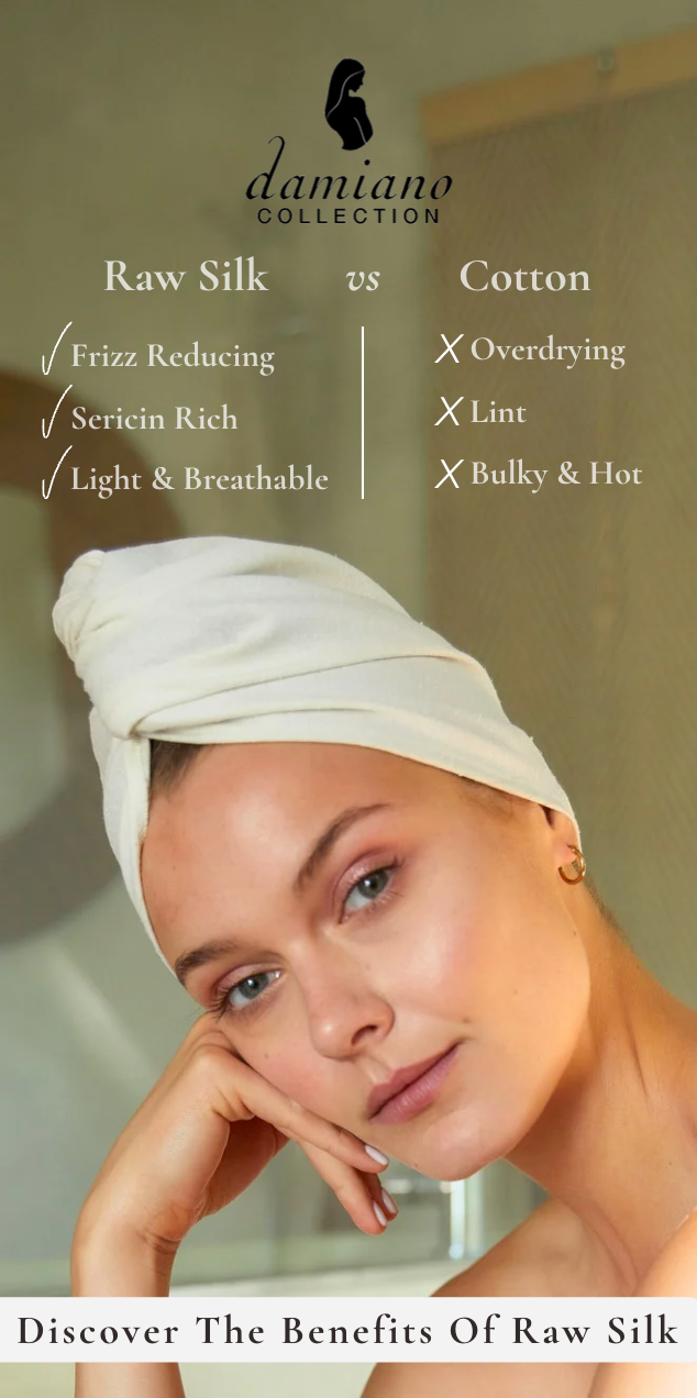 Traditional cotton towels can often leave hair over-dried and frizzy by removing essential oils and moisture. In contrast, raw silk possesses the perfect absorbency properties to only remove excess water, allowing your hair's natural oils and conditioners to remain intact. Plus, raw silk contains sericin, a natural protein that helps keep hair soft and shiny.