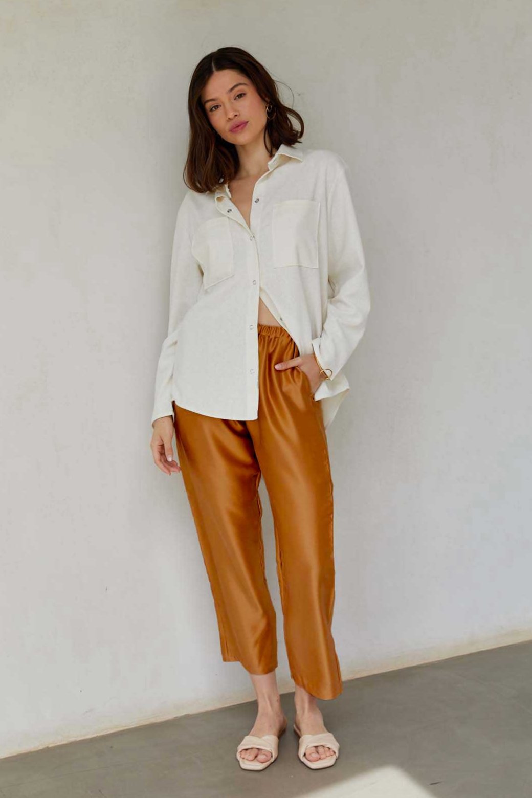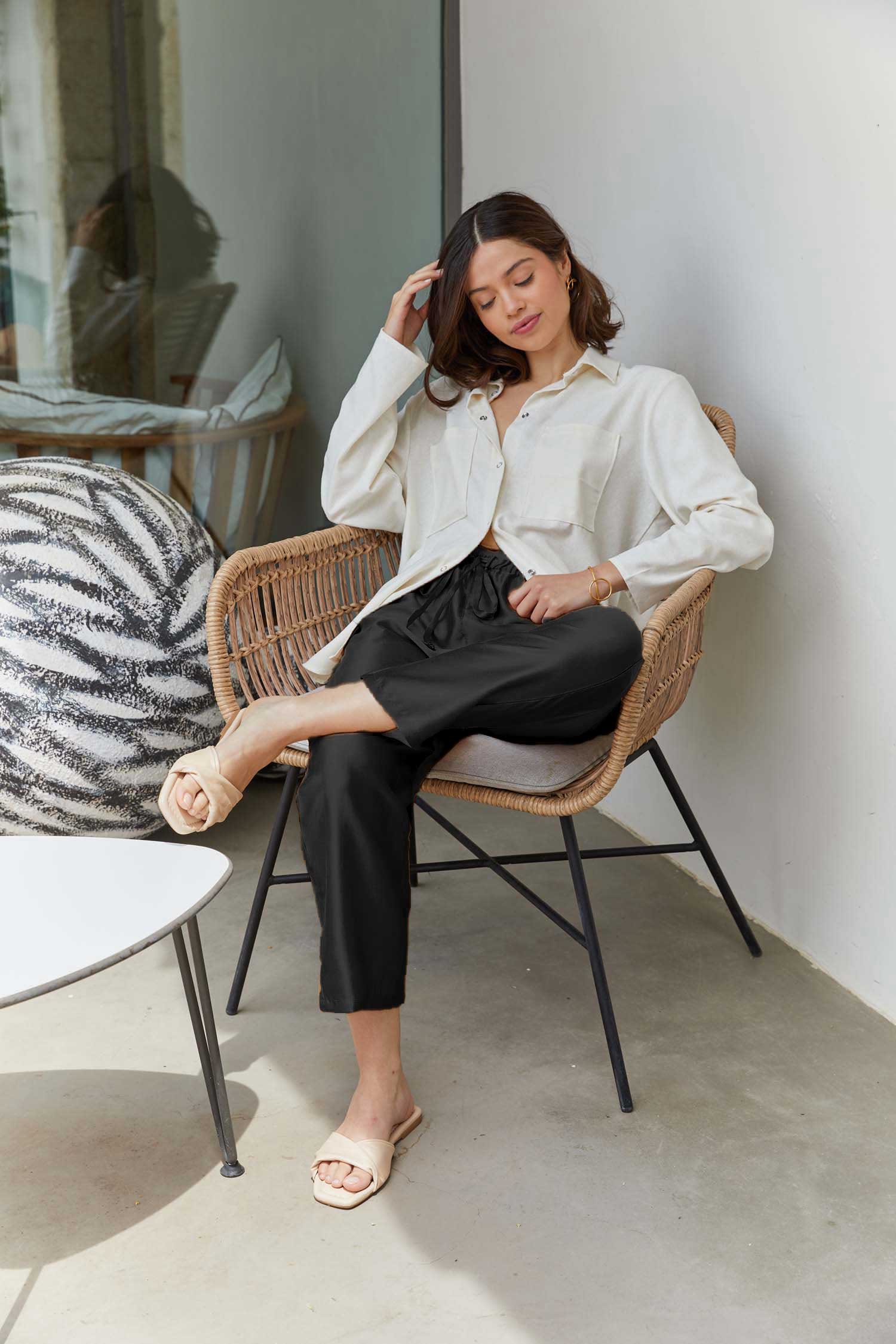 These relaxed fit tapered trousers are cut from premium sandwashed silk, ideal for comfort, breathability, and easy care. The trousers feature an elastic drawstring waist and low-profile side seam pockets.